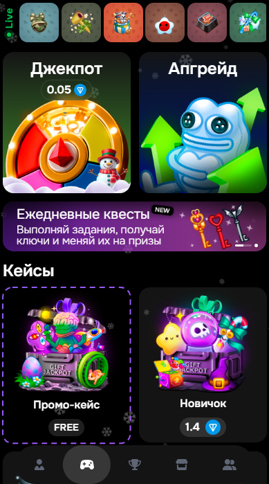 В верхней части интерфейса находится Live-строка, где отображаются актуальные выигрыши и дроп пользователей. Это добавляет динамики и показывает активность внутри бота.