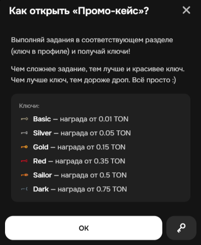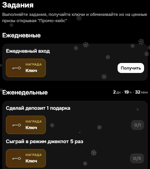 Промо-кейсы — бесплатные кейсы, которые открываются с помощью ключей. Ключи бывают разных типов, и от их качества зависит дроп. Получить их можно, выполняя задания в разделе «Ежедневные квесты».