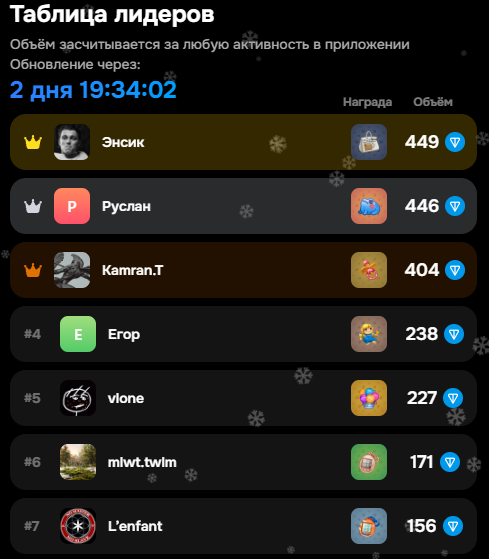 Чем выше активность, тем выше позиция в рейтинге и награды.